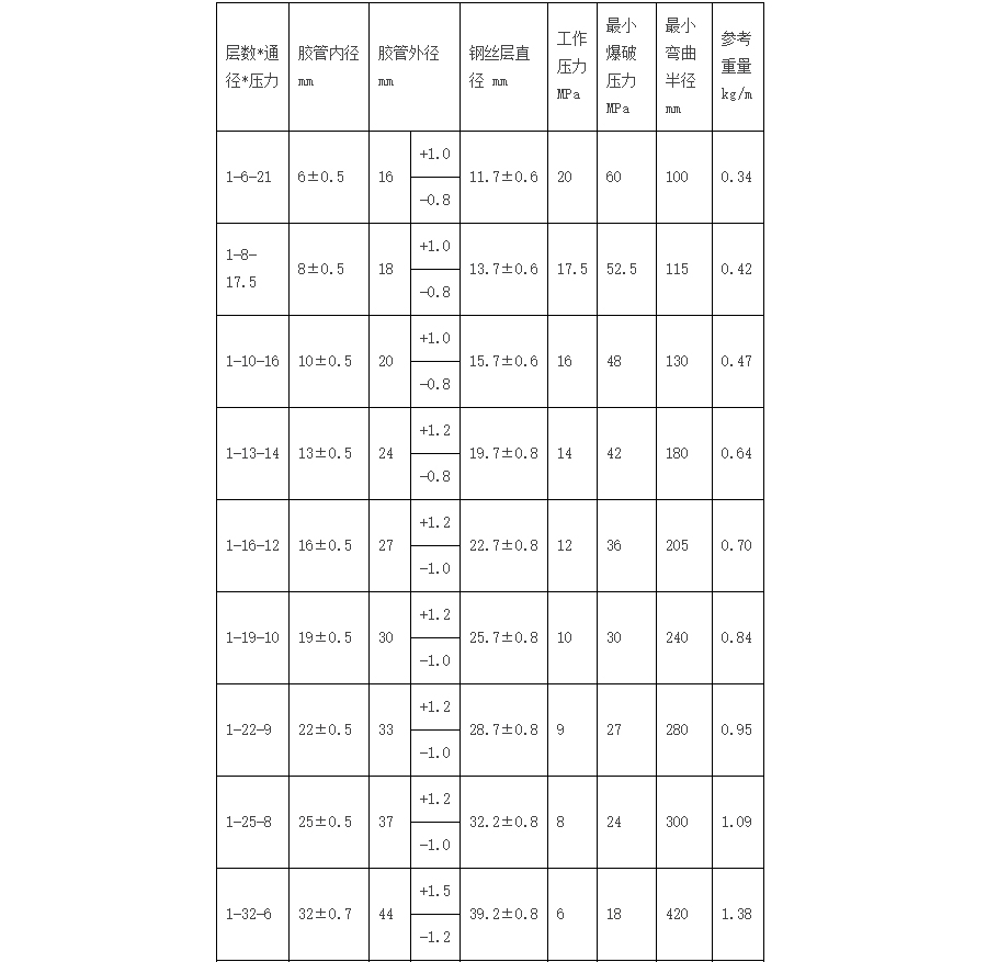 一、鋼絲編織膠管結構是由耐液體的合成橡膠內膠層、中膠層、Ⅰ或Ⅱ或Ⅲ層鋼絲編織增強層、及耐天候性能優(yōu)良的合成橡膠外膠層組成。