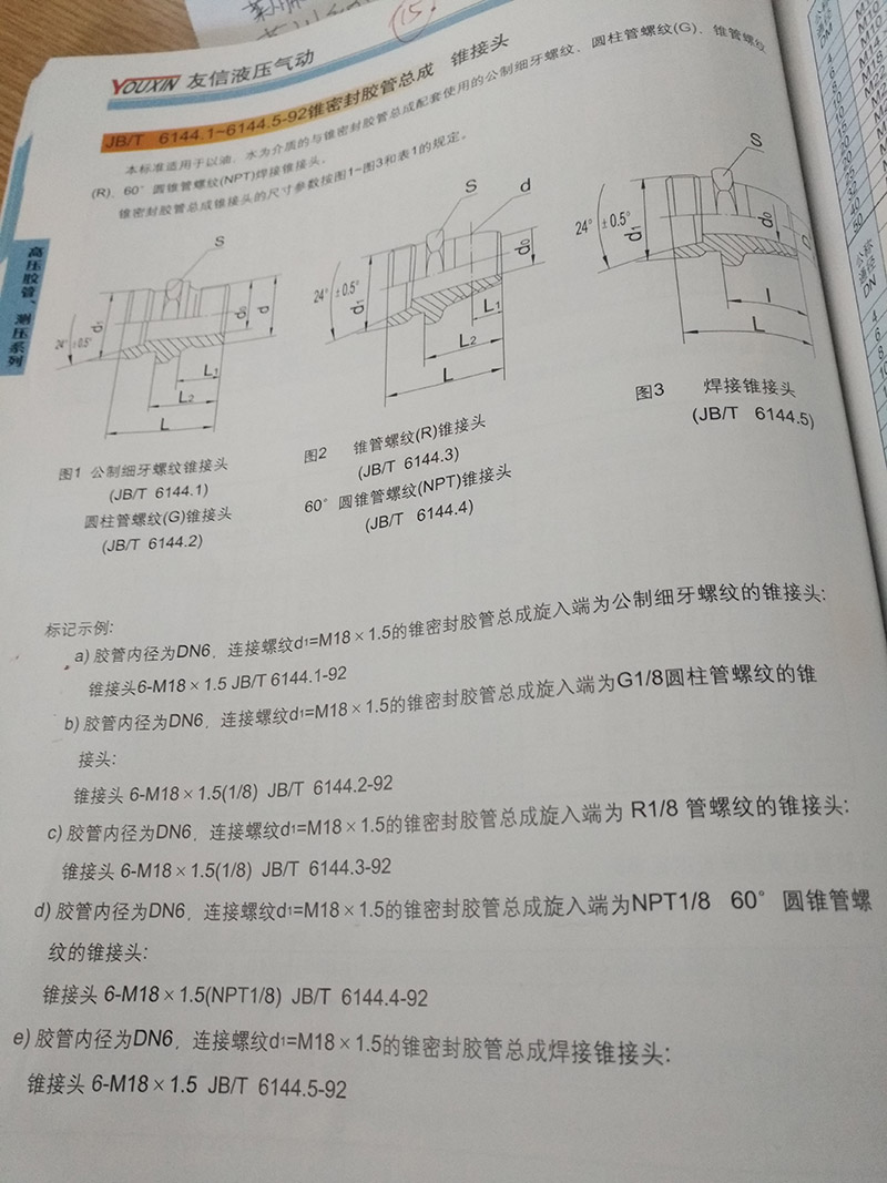 a)膠管內(nèi)徑為DN6,連接螺紋d1=M18*1.5的錐密封膠管總成旋入端為公制細(xì)牙螺紋的錐接頭:錐接頭6-M18*1.5 JB/T 6144.1-92