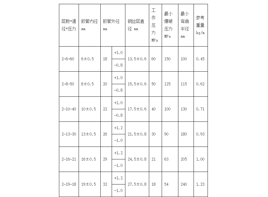 鋼絲增強(qiáng)液壓橡膠軟管主要用于礦井液壓支架、油田開采,適宜于工程建筑、起重運(yùn)輸、冶金鍛壓、礦山設(shè)備、船舶、注塑機(jī)械、農(nóng)業(yè)機(jī)械、各種機(jī)床以及各工業(yè)部門機(jī)械化、自動(dòng)化液壓系統(tǒng)中輸送具有一定壓力和溫度的石油基(如礦物油、可溶性油、液壓油、燃油、潤滑油)液體、水基液體(如乳化液、油水乳濁液、水)、氣體等和液體傳動(dòng)用。